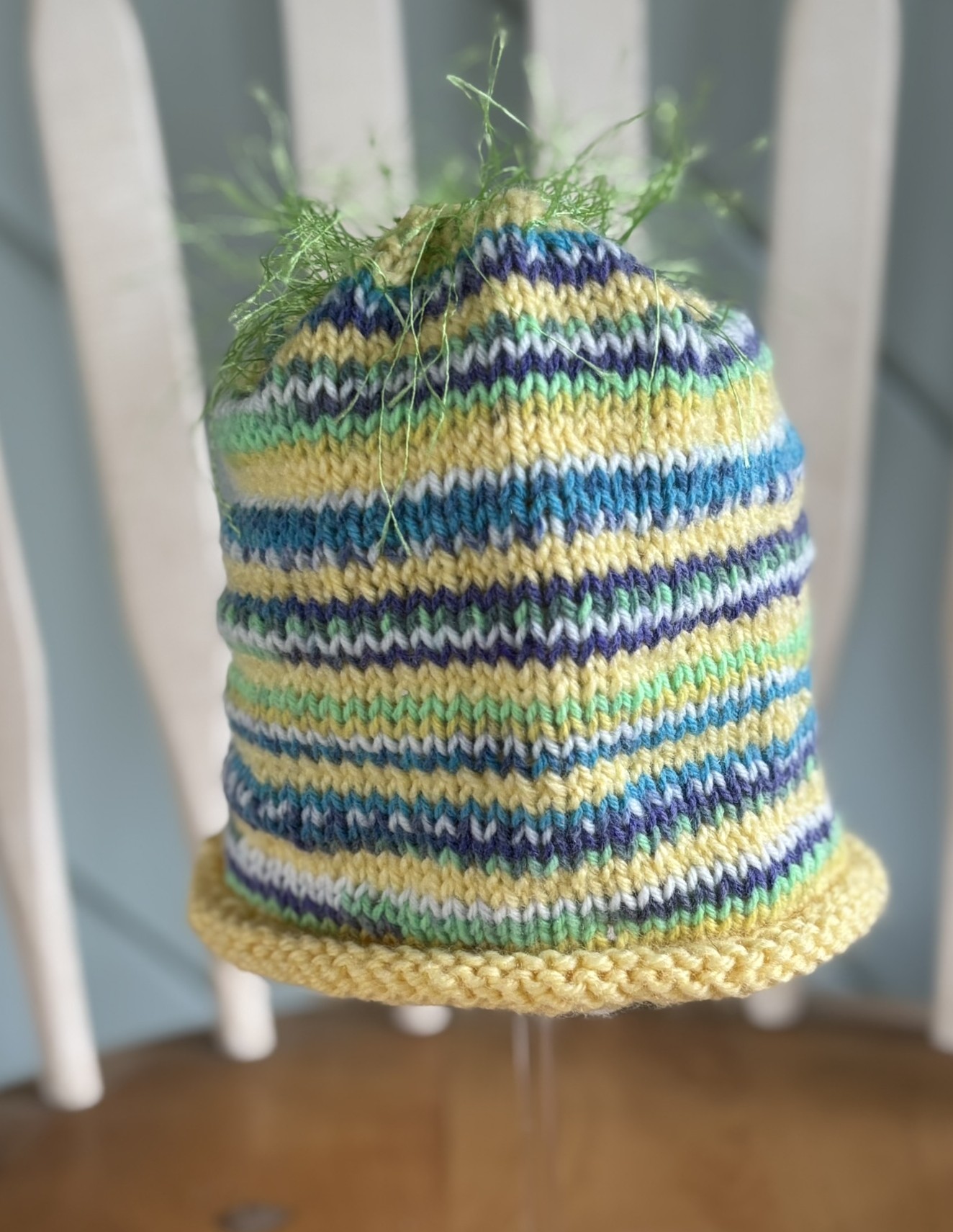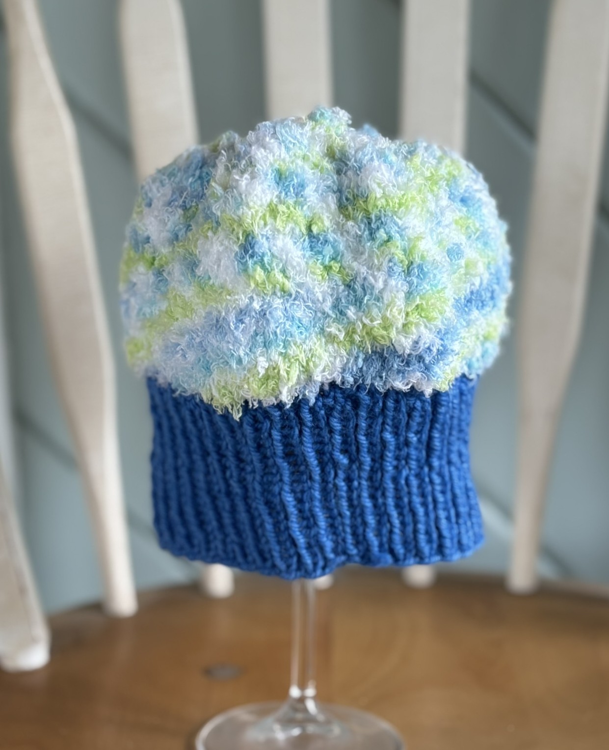 Acrylic and wool, cornflower blue with soft white/blue green, size 6-15 months, price $15