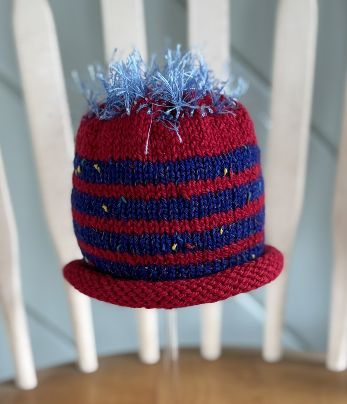 Acrylic and wool, bright red and shades of blue, size 0-6 months, price $15