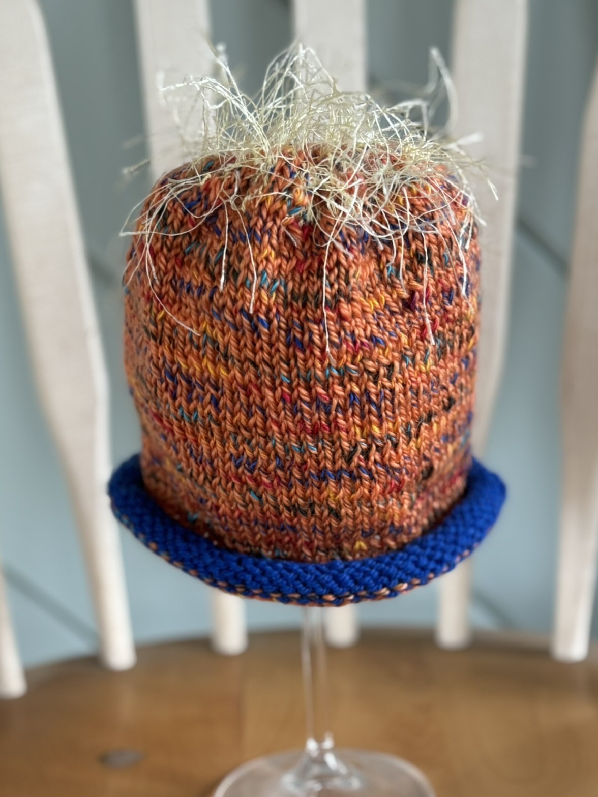 Acrylic and wool, tangerine orange, blue, yellow, size 6-15 months, price $15