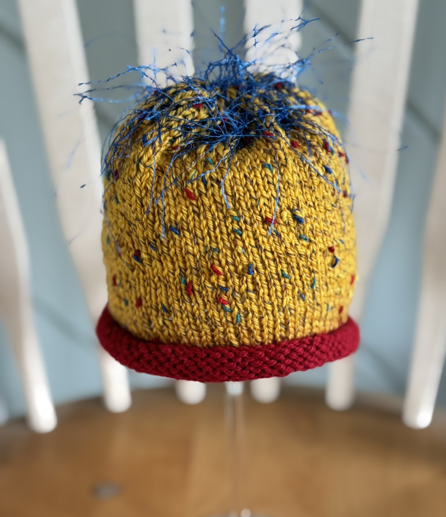 Acrylic and wool, marigold yellow, red and blue, size 0-6 months, price $15